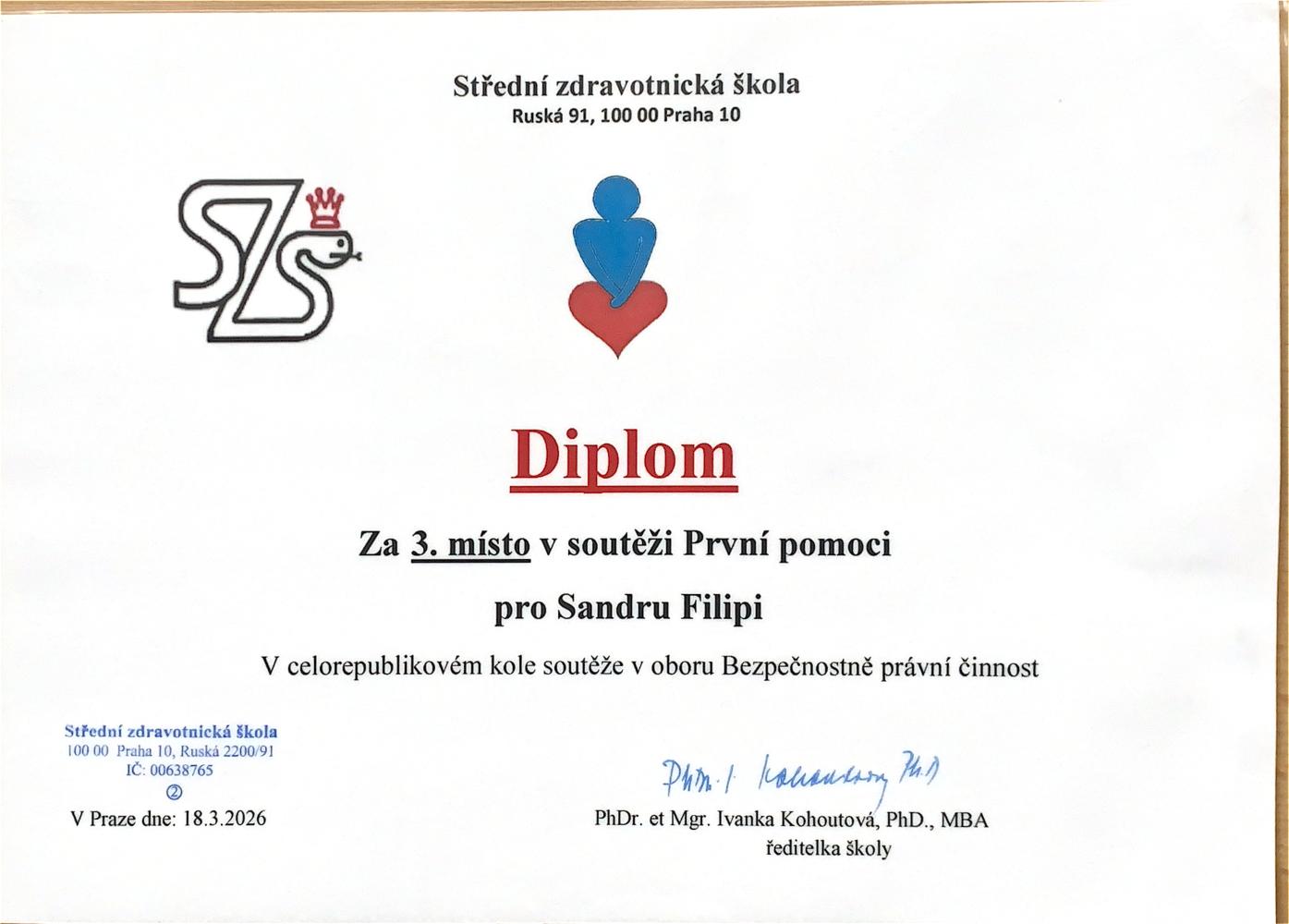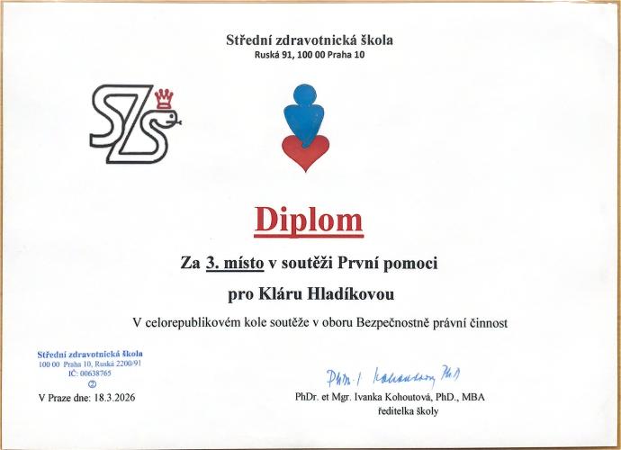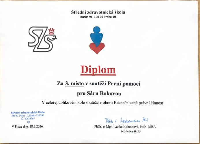 Dne 18.3.2026 se konal 9. ročník celorepublikové soutěže První pomoci v oboru Bezpečnostně právní činnosti na SZŠ Ruská , Praha 10. Naše družstvo ve složení Sára Boková, Sandra Filipi a Klára Hladíková obsadilo skvělé 3. místo v konkurenci 15 škol z celé České republiky.