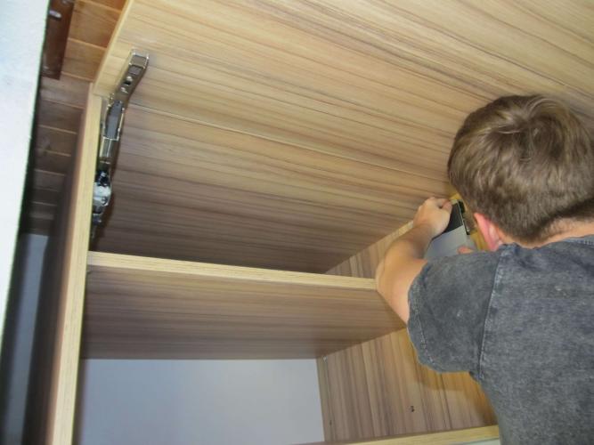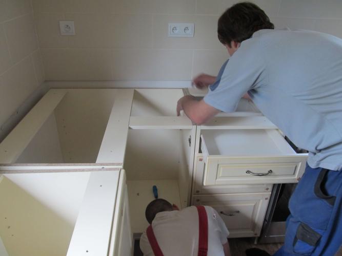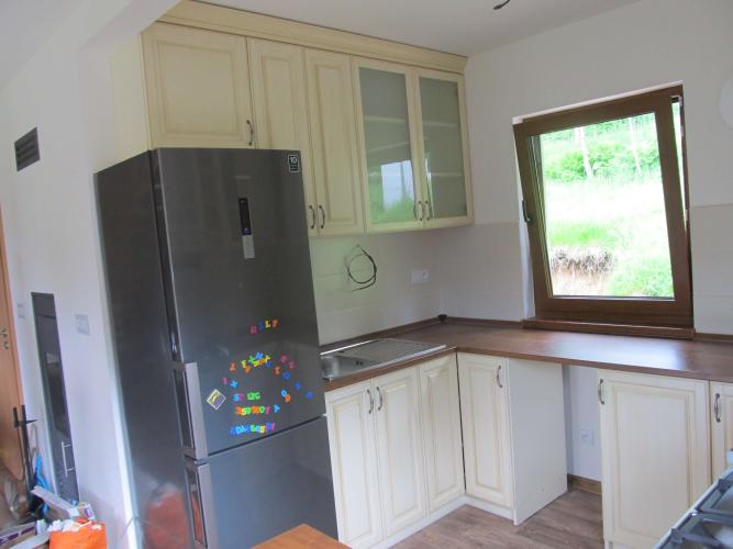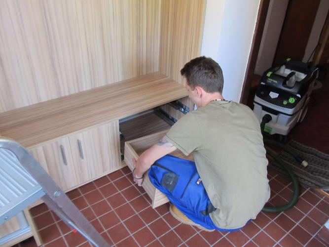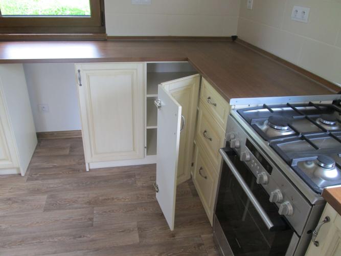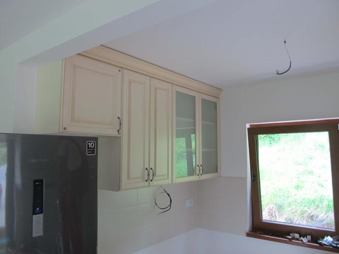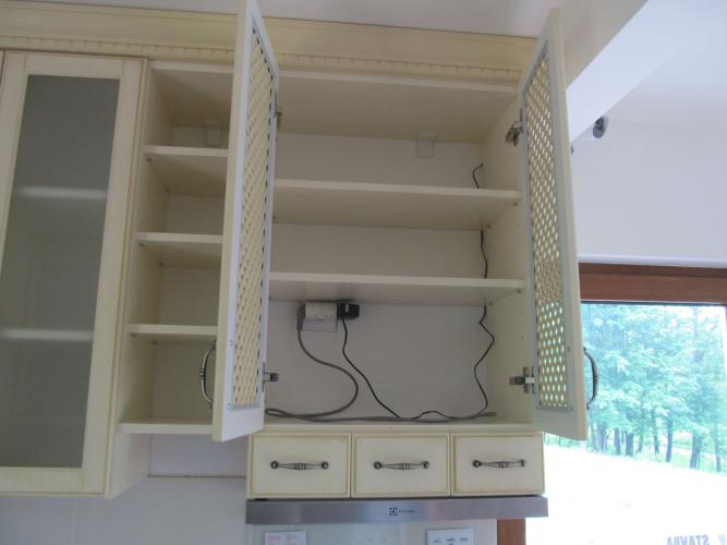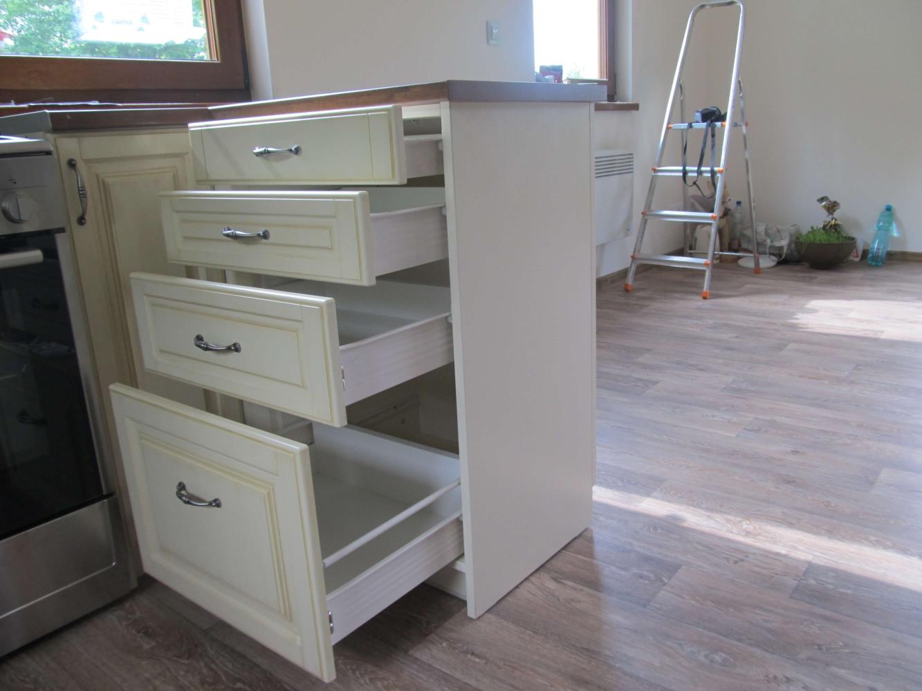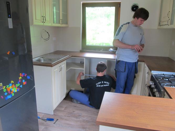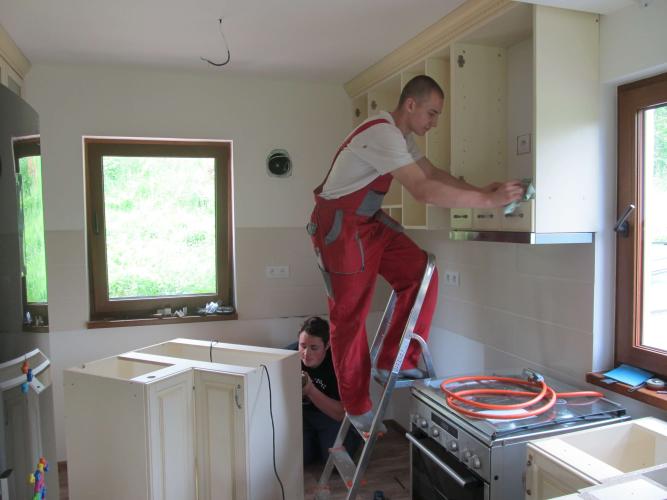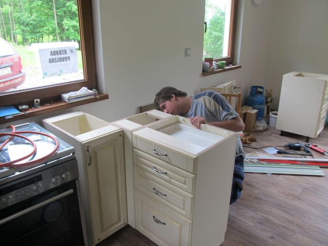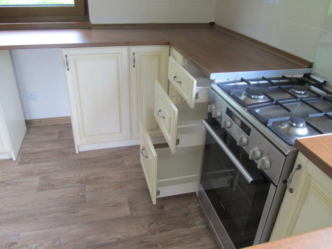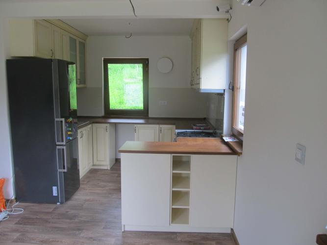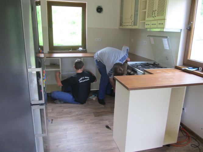Výroba kuchyňské linky - dřevodekor + krémová dvířka